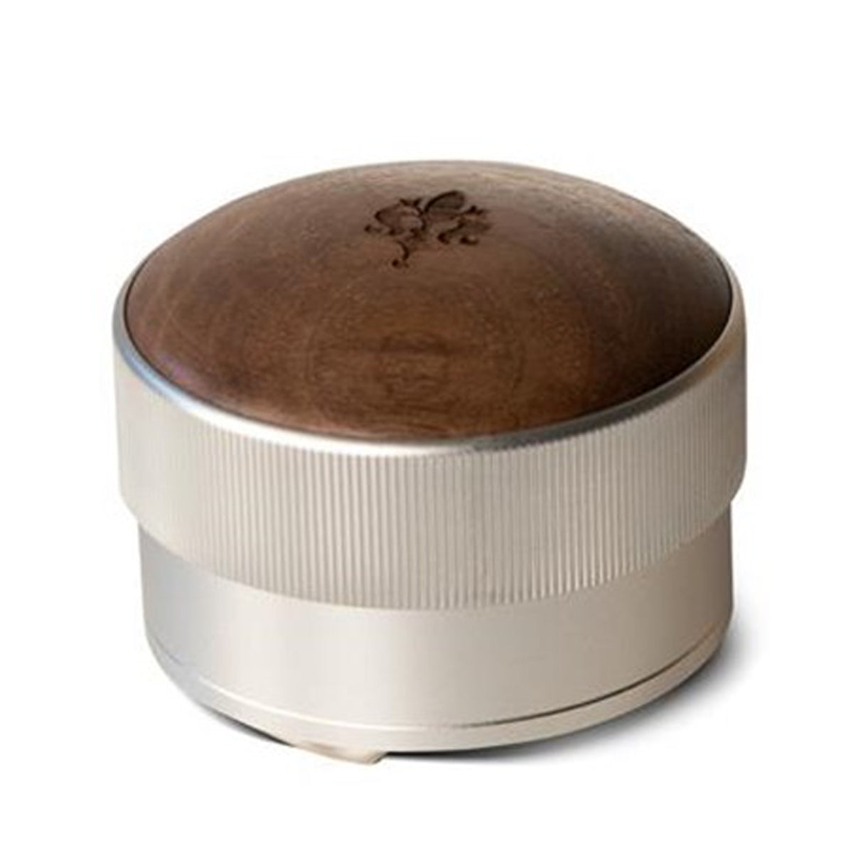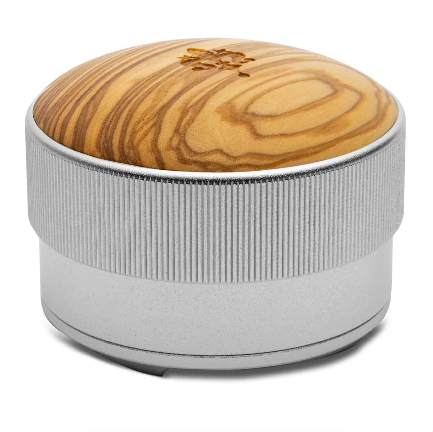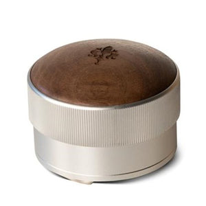 Eureka leveling tool in stainless steel and wood top, for a even and leveled coffee distribution.