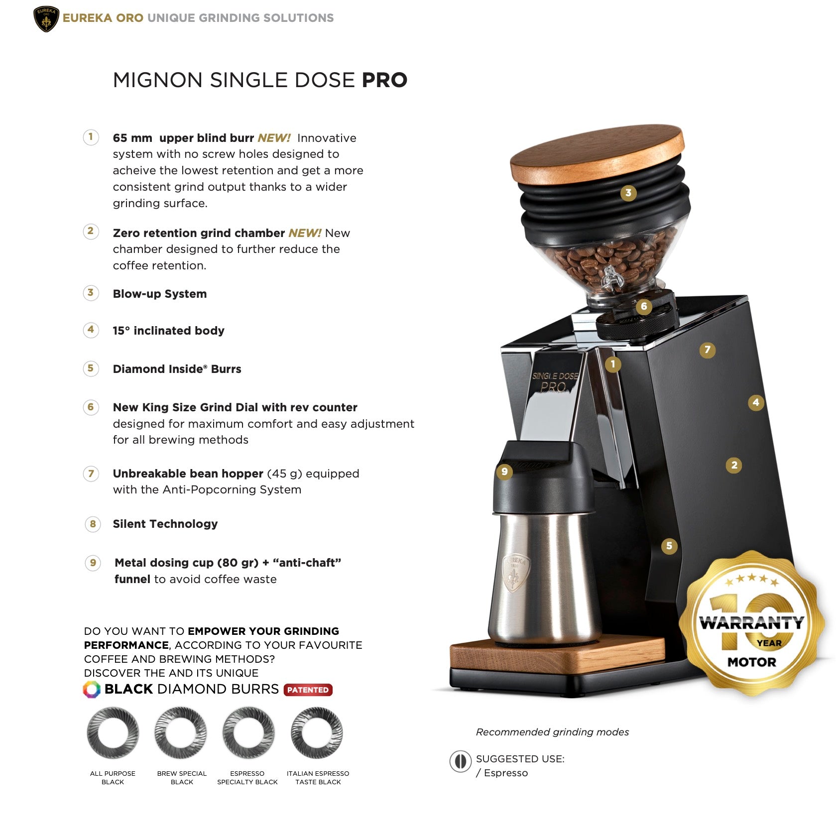 For all Eureka Single Dose Pro grinders purchased after June 1, 2025, a 10-year motor warranty applies.
