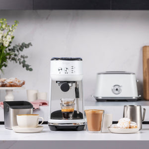 Med 18 gram kaffe i det medfølgende 54 mm portafilter i rustfrit stål, får du en fyldig smag og mælkeskummeren sikrer silkeblød mikroskum, der giver et godt udgangspunkt for latte art.