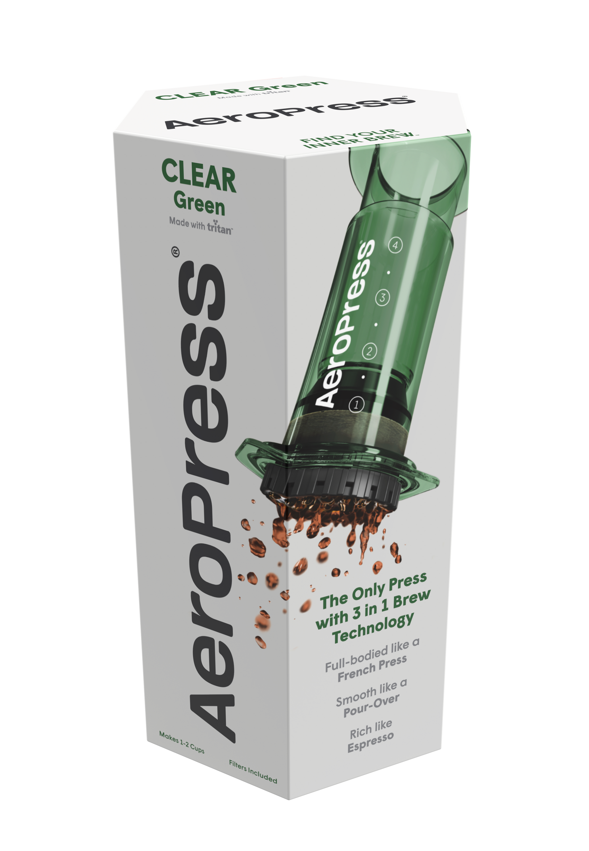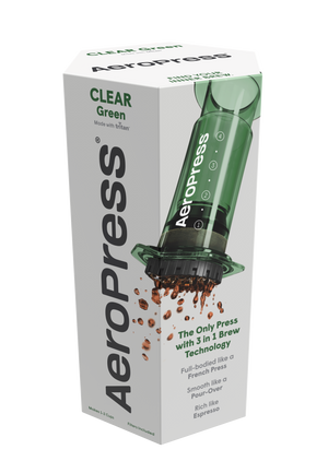 AeroPress Clear i grön AeroPress Clear – Samma fantastiska bryggning, nu i regnbågens färger AeroPress Clear är den klassiska AeroPress du känner och älskar, men nu tillverkad i hållbart, färgat Tritan™-material. Den är lika robust som alltid och redo att tas med på resan – eller pryda kökshyllan. 3-i-1 bryggteknologi kombinerar fördelarna med espresso, pour-over och presskanna i en kompakt, portabel enhet. Resultatet? En fyllig, len och sumpfri kopp kaffe med en långvarig smak som du kan njuta av till sista droppen. Kompakt och hållbar – AeroPress Clear är lätt att ta med på resan, så du aldrig behöver nöja dig med medelmåttigt kaffe, oavsett om du är på hotell, kontor eller camping. AeroPress Clear Color finns i röd, blå, grön, lila och svart.