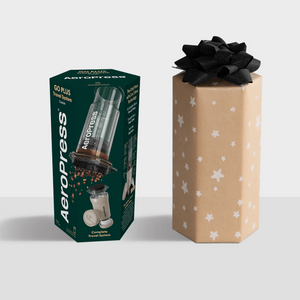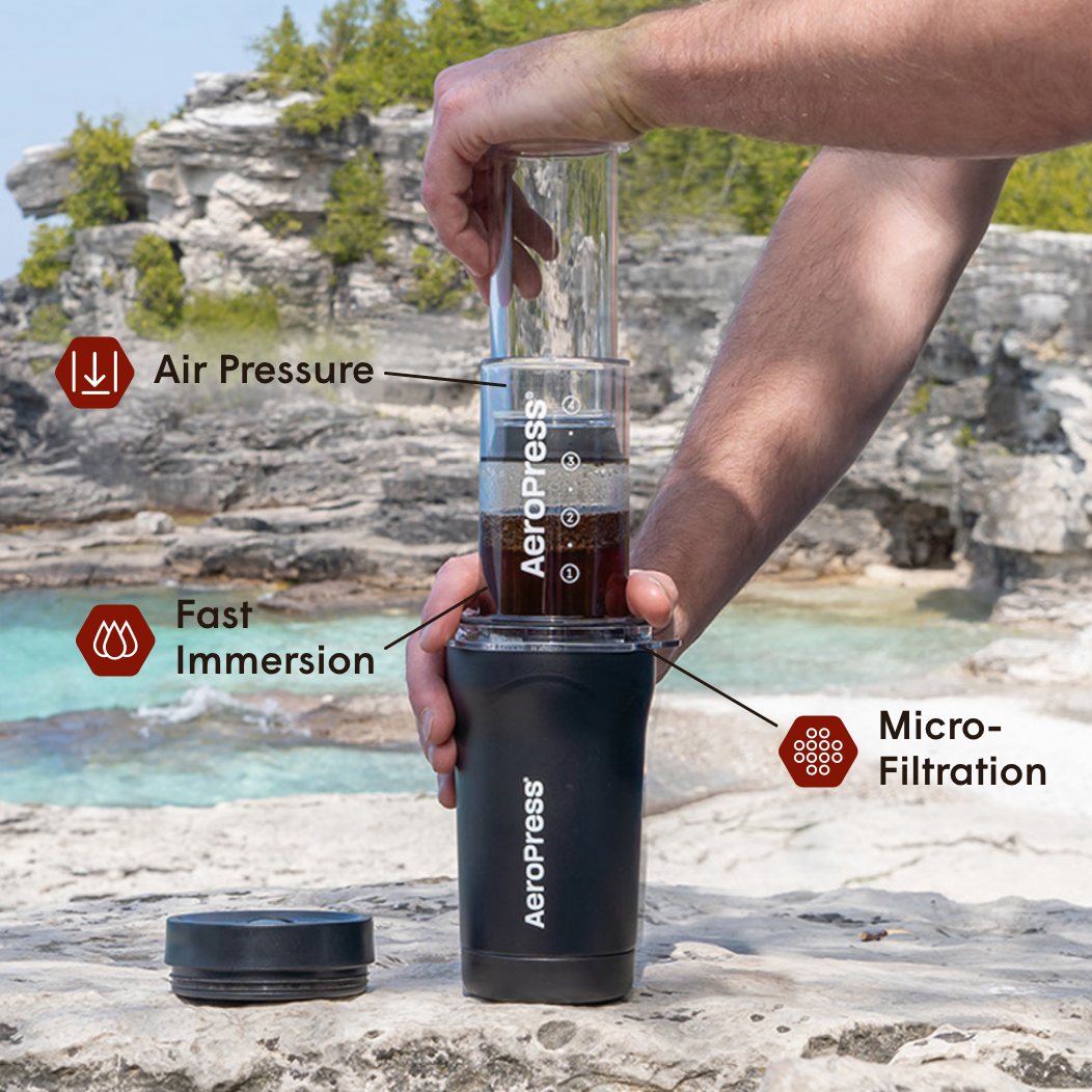 AeroPress Go Plus är ett komplett resekaffesystem – du kan packa upp det, brygga silkeslen kaffe och packa ner pressen igen i den medföljande termomuggen, som även fungerar som förvaringsbehållare.
