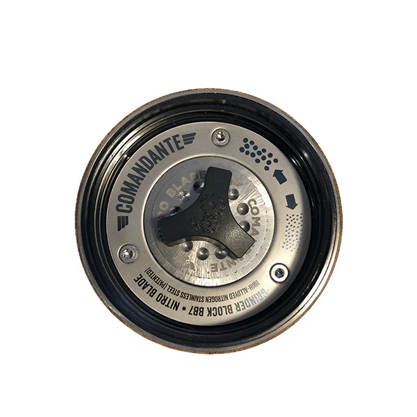 Comandante Liquid Amber har en yta av valnötsfaner, dessutom är knivsatsen tillverkad av metall med högt kväveinnehåll, vilket är resultatet av dedikerad produktutveckling och din garanti för ett sublimt resultat i koppen.