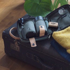 Resväskan har också en praktisk ficka för annat tillbehör såsom en smaksked eller en borste. Resväskan är gjord av stark bomull och har mjuka läderhandtag för att göra den säker och bekväm att bära.