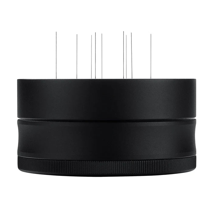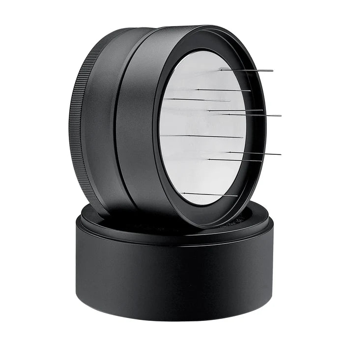 Fördelaren placeras ovanpå filterkorgen och snurrar nålarna runt, nästan som du känner igen från en leveler. Detta gör att fördelningen och nedbrytningen av klumpar i kaffet blir ännu mer precis och skonsam.