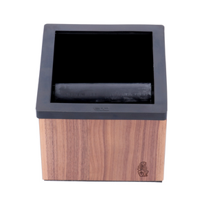 Elegant knock box i valnöt för att hålla din bänkskiva ren. Hållbar och vackert designad med träinsats och stålkärna. Perfekt för varje kaffeentusiast.
